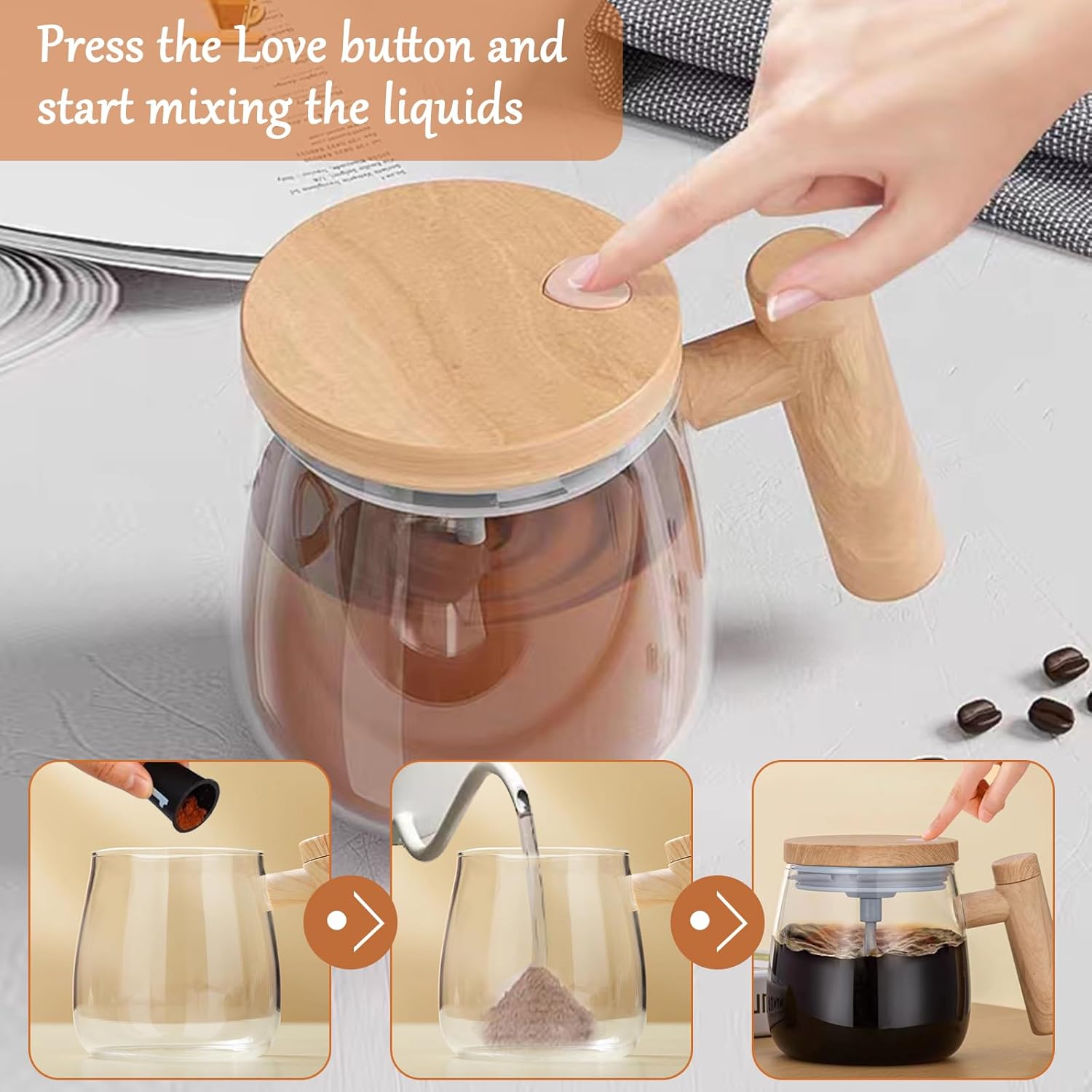 Smart automatic mixing mug with one-touch button. Ideal for coffee, tea, milk, and protein drinks. Stylish, durable, and easy to use.